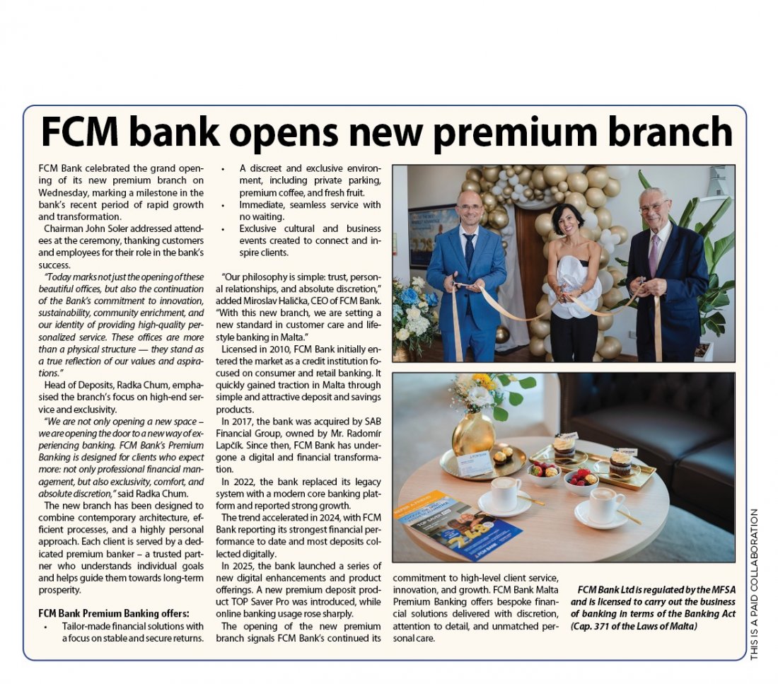 According to CEO Miroslav Halička, the Bank’s philosophy is built on trust, personal relationships, and absolute discretion. With this new banking branch, FCM Bank reinforces its long-standing commitment to innovation, sustainability, and delivering a superior client experience.