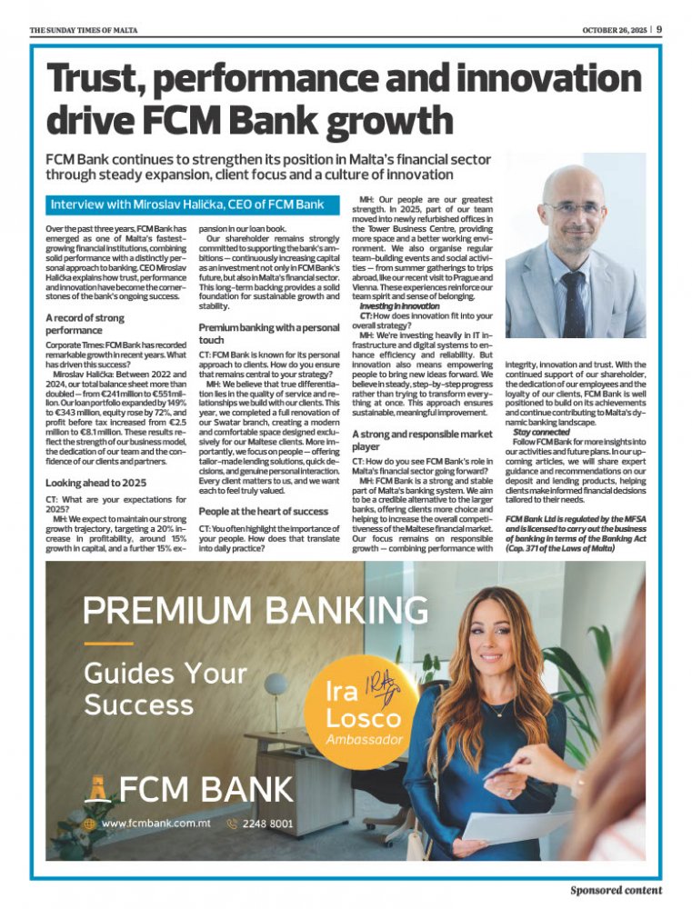 Over the past three years, FCM Bank has become one of Malta’s fastest-growing financial institutions, with its balance sheet more than doubling to €551 million between 2022 and 2024. CEO Miroslav Halička attributes this success to trust, performance, and innovation, emphasizing the bank’s commitment to personal client relationships, investment in digital systems, and a strong corporate culture. Looking ahead to 2025, FCM Bank targets further profitability and loan growth, supported by continued shareholder investment and a focus on sustainable, responsible expansion within Malta’s financial sector.